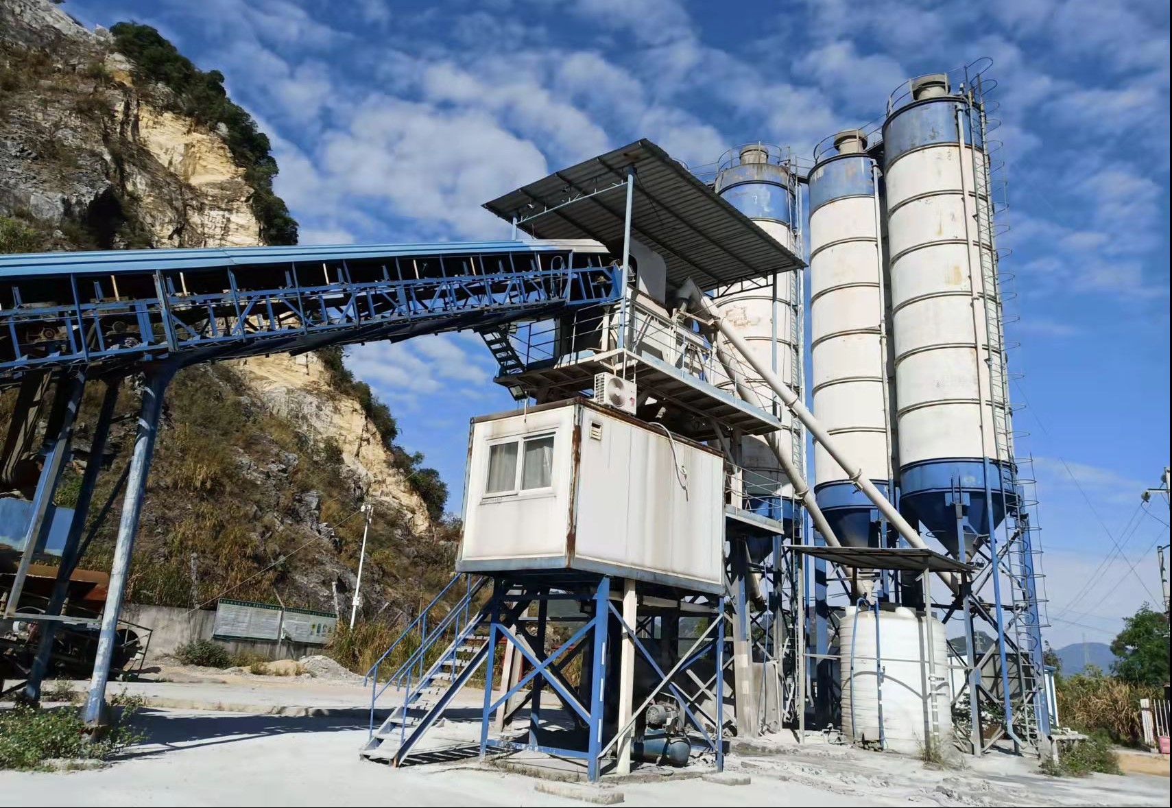 主要设备为机械生产设备。主要包括二套HZS180强制式混凝土搅拌站:生产率为180 m3/h,搅拌机容量3000 L/罐,搅拌机允许最大骨料180 mm;一套HZS150强制式混凝土搅拌站:生产率为150 m3/h,搅拌机允许最大骨料150 mm;一套筛分系统:给料机2台(WL1m×2m 7.5KW、SW1020 7.5KW),洗砂机1台(XSD3018 11KW),振动筛2台(2SS2270 30KW、2SS2060 22KW),圆锥式破碎机1台(S155);输送系统:输送皮带及附属电机设备3套,其中118KW,1000mm的有190米,55KW,800mm的有53米,37KW,650mm的有170米;一套筛分及附属设备系统:包括2YA1860振动筛一台,输送皮带及附属电机设备(规格型号800mm ,22KW)18米,输送皮带及附属电机设备(规格型号650mm ,7.5KW)24米;四台门式起重机(MHH5-24、MHH10-24、MHH5-20、MHH5-20)。目前放置于广东省清远市英德市北江(曲江乌石至三水河口)。